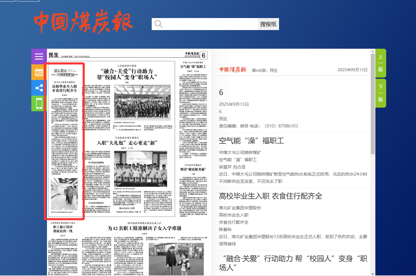 《中国煤炭报》9月13日六版:淮北矿业集团尊龙凯时d88 高校毕业生入职 衣食住行配齐全