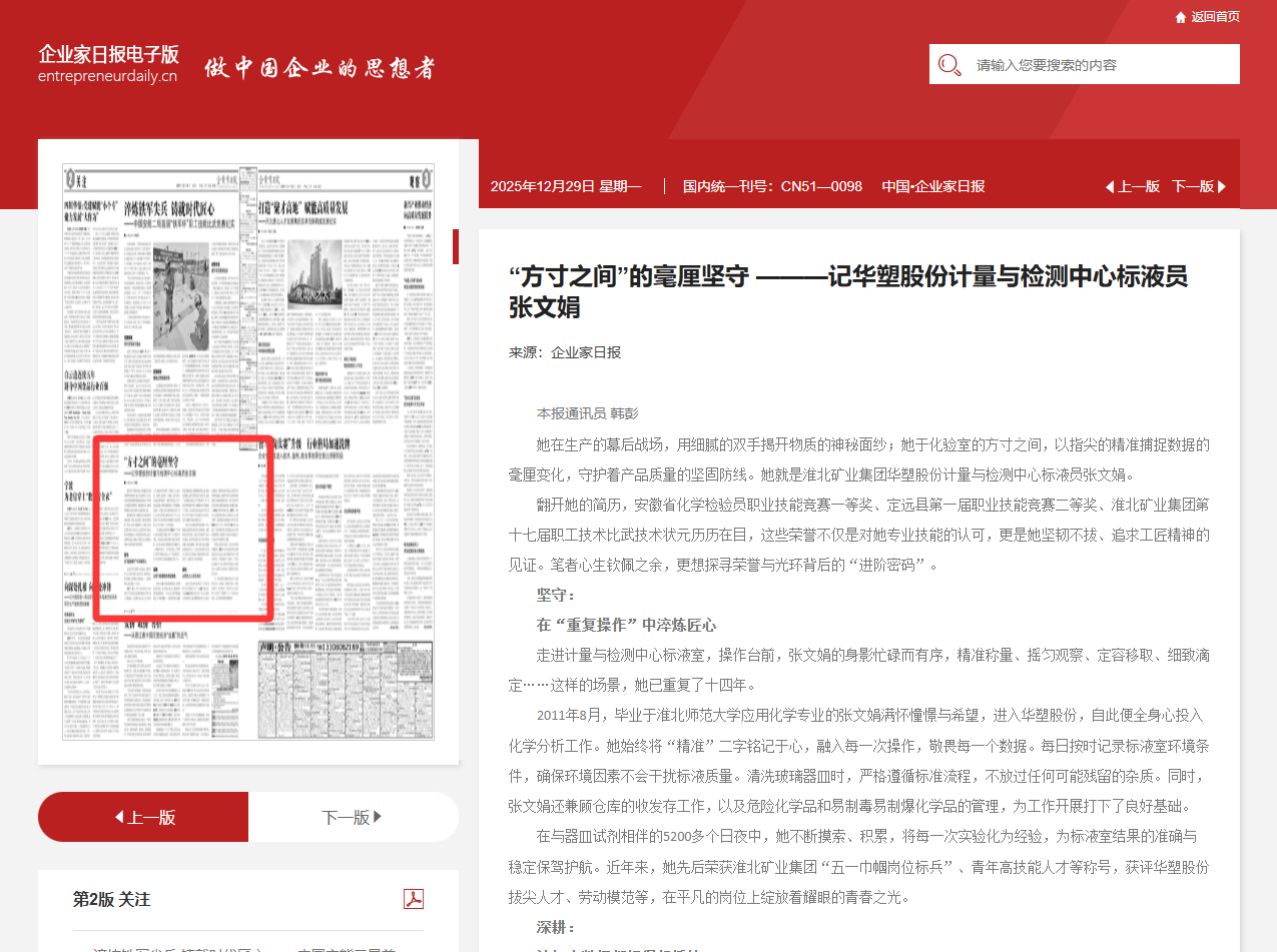 《企业家日版》12月28日二版:“方寸之间”的毫厘坚守 ———记尊龙凯时d88 计量与检测中心标液员张文娟
